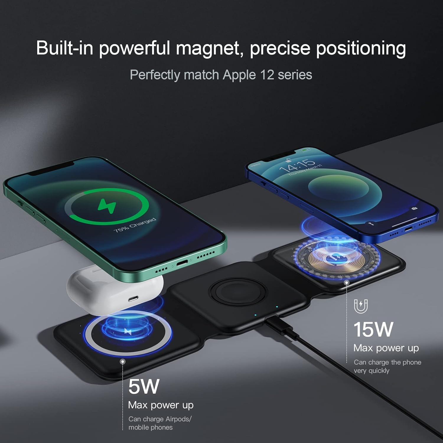 【شارژر بیسیم 3 در 1】این ایستگاه شارژ میتواند اکثر تلفنها را شارژ کند، از شارژ سریع برای چندین دستگاه اپل به طور همزمان پشتیبانی میکند، سازگار با iPhone 14 13 12 11/Pro/XS/XR/SE/8 یا Android؛ اپل واچ 7/6/5/4/3/2/3/3/3/3/3/2/3 وایرپاد، ایرپاد 2/3 وایرپاد (Airpods) نسخه غیر بی سیم). وسیله ای ضروری برای طرفداران اپل. با شارژرهای جداگانه خداحافظی کنید. شارژر بی سیم فقط برای تلفن های همراهی مناسب است که می توانند از شارژ بی سیم پشتیبانی کنند.