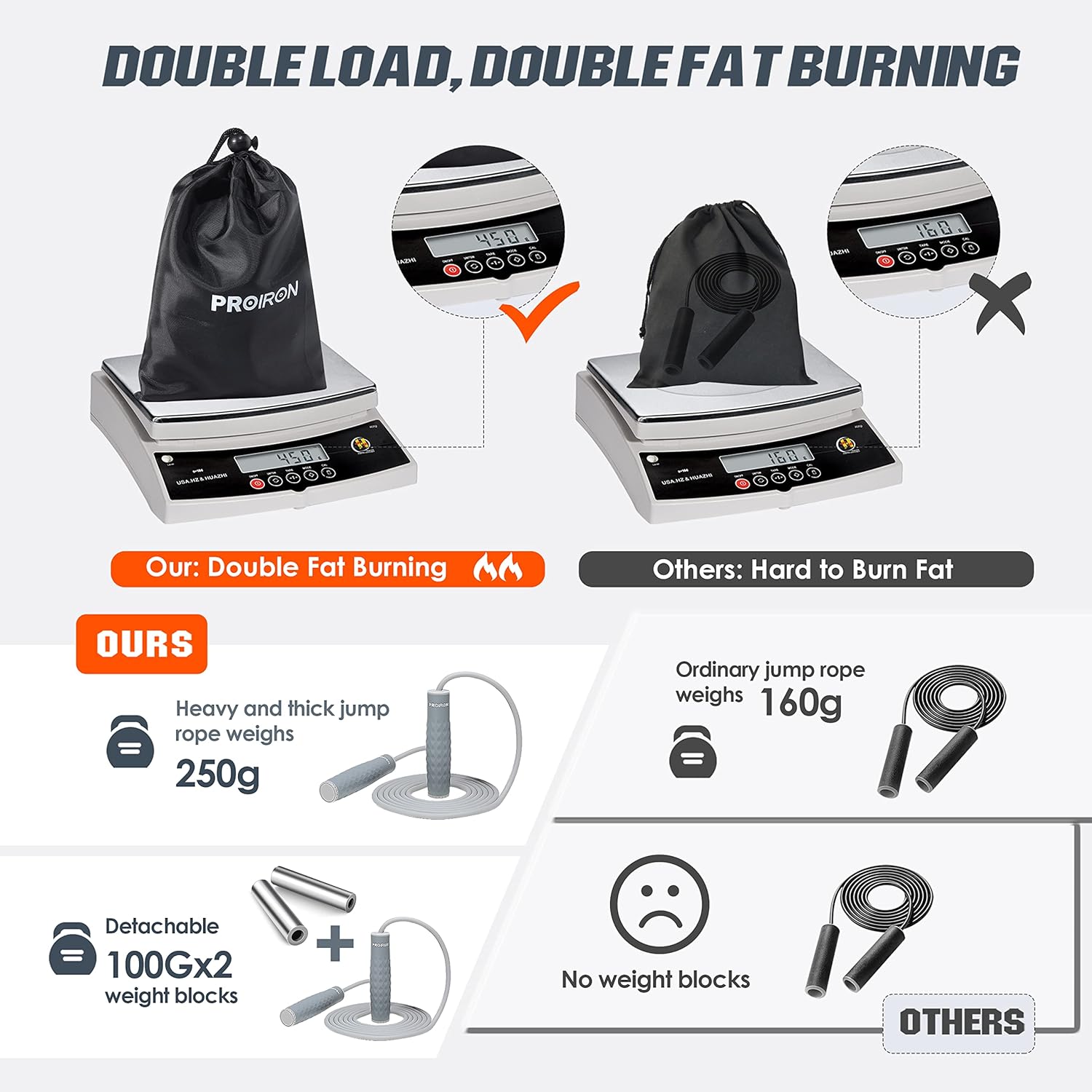 【چربی سوزی دو وزنه و مضاعف】 طناب پرش با وزن عمومی توسط طناب یا دسته وزن می شود. طناب پرش وزن دار PROIRON از حالت وزنی طناب با وزنه و دسته وزنه استفاده می کند که تاب را قدرتمندتر می کند، سوزاندن چربی بدن را دو برابر می کند و عملکرد بدن را به طور موثر بهبود می بخشد.