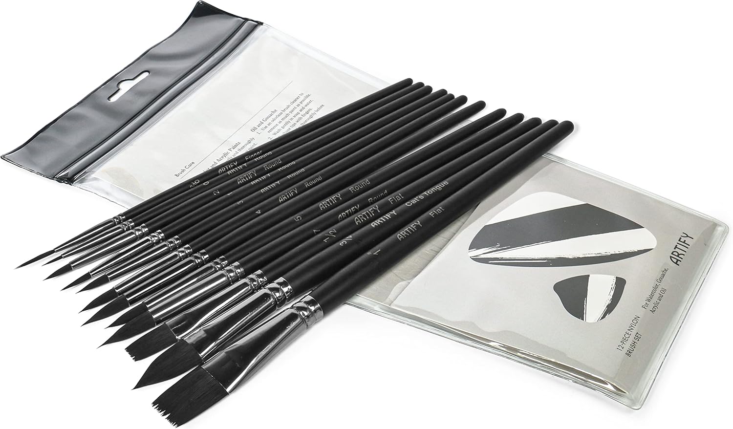 لوازم هنری ARTIFY برس های رنگ آبرنگ 12 تکه، سری متوسط، برس های نایلون مصنوعی برای نقاشی آبرنگ، اکریلیک، گواش و رنگ روغن، شامل گرد، تخت، زبان گربه ای