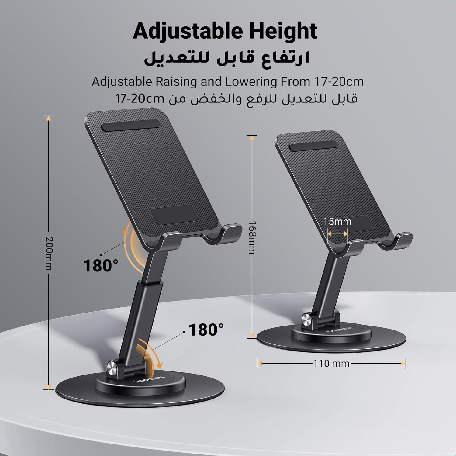 پایه تلفن UGREEN با چرخش 360 درجه و پایه فلزی قابل تنظیم ارتفاع برای پایه آیفون تاشو روی میز سازگار با دستگاه های تا 9.7 اینچ مناسب برای iPhone 17 Pro Max Galaxy S25 Ultra S24 Black