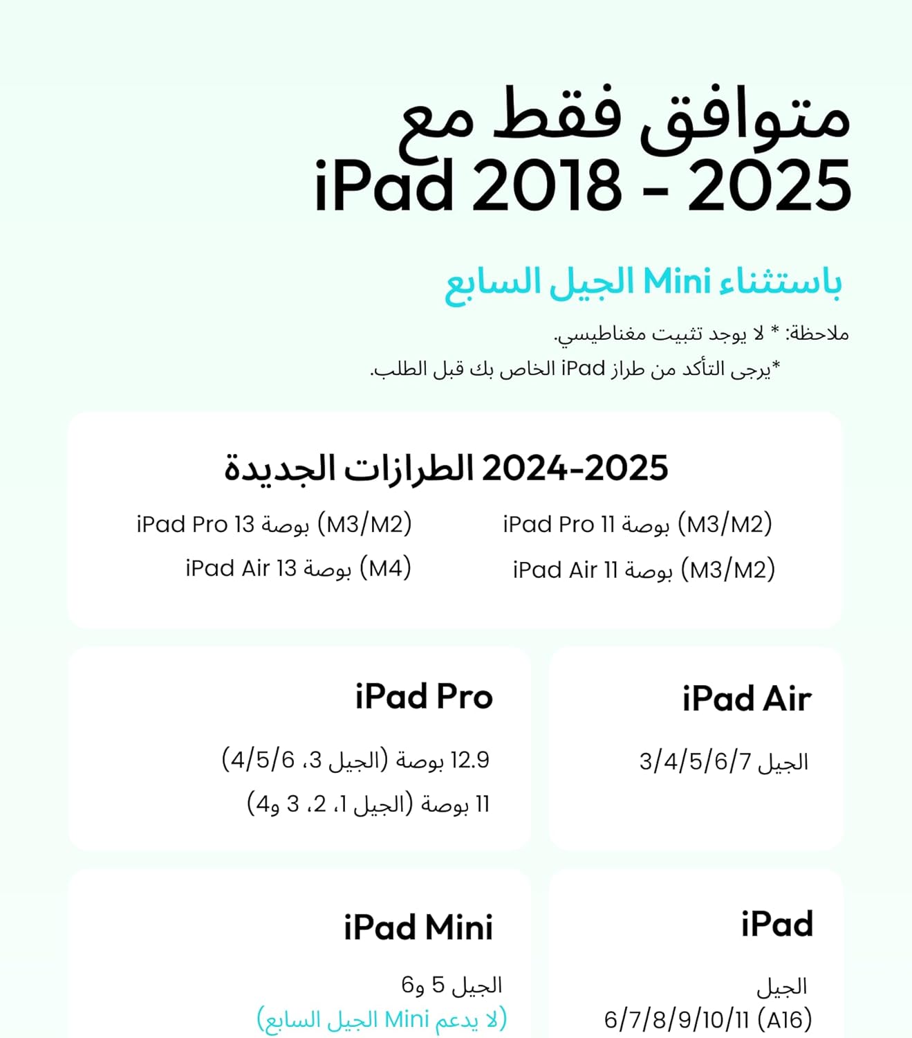 سازگاری: با آیپدهای نسل ۶ تا ۱۱، آیپد ایر ۳/۴/۵/M2/M3، پرو ۱۱/۱۲.۹/۱۳ اینچ (M4)، مینی ۵/۶.